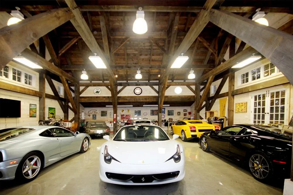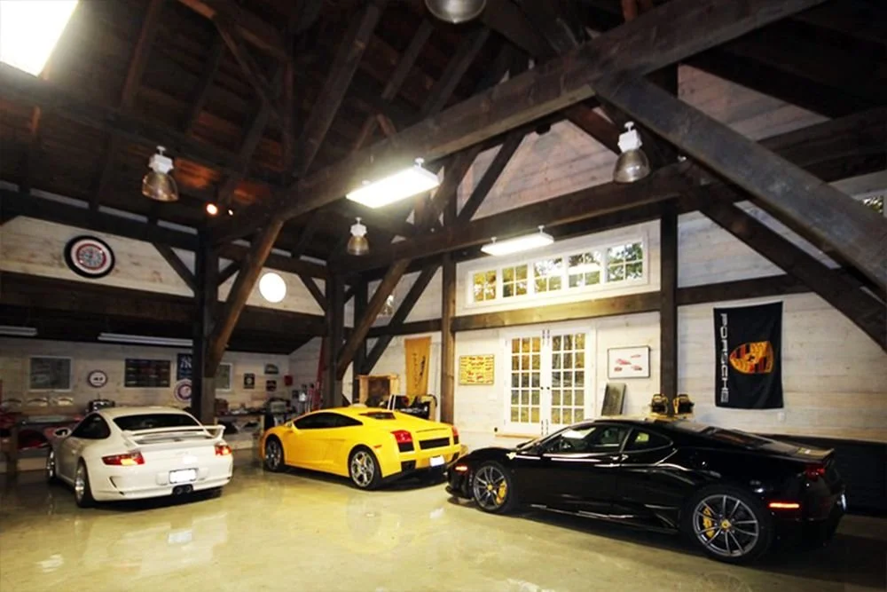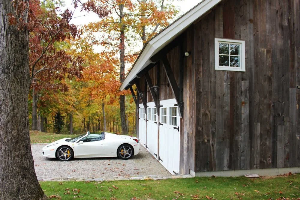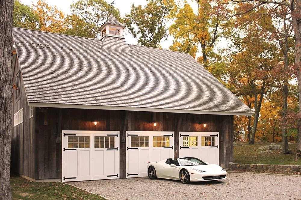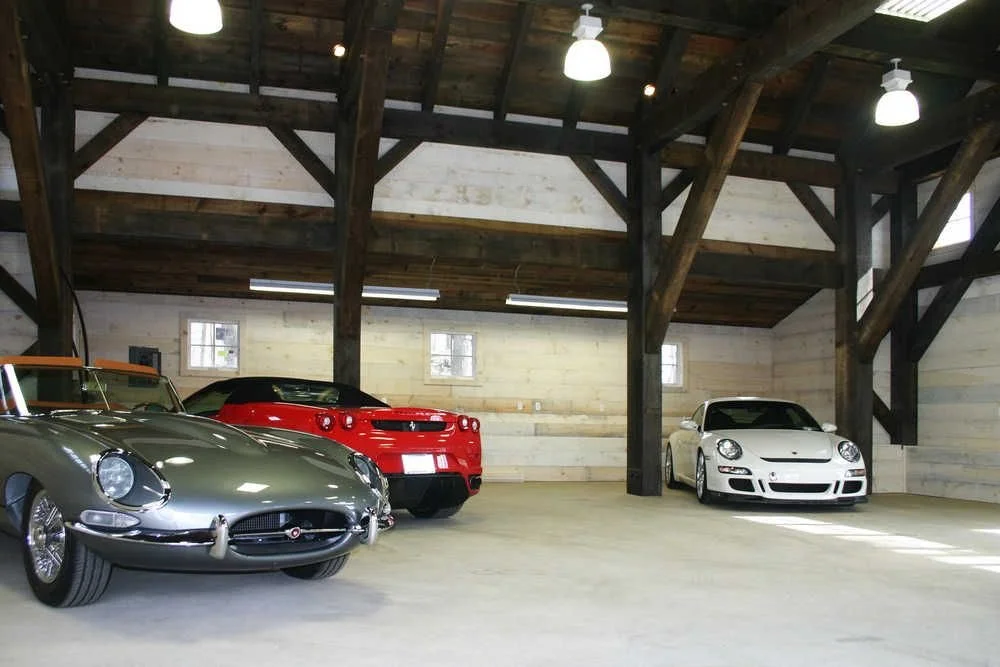 Car Barn I is a large timber frame barn built in a coastal style to store an equally beautiful collection of cars.