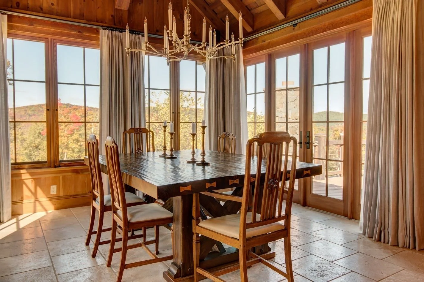 An expansive two story great room with a custom stone wood-burning Russian stove and pizza oven, wood-lined stair turret, custom forged metal railings, zinc countertops, gas lanterns illuminating the stair and hallway, indoor grill room, and a year-round pool and hot tub patio overlooking the green mountains.