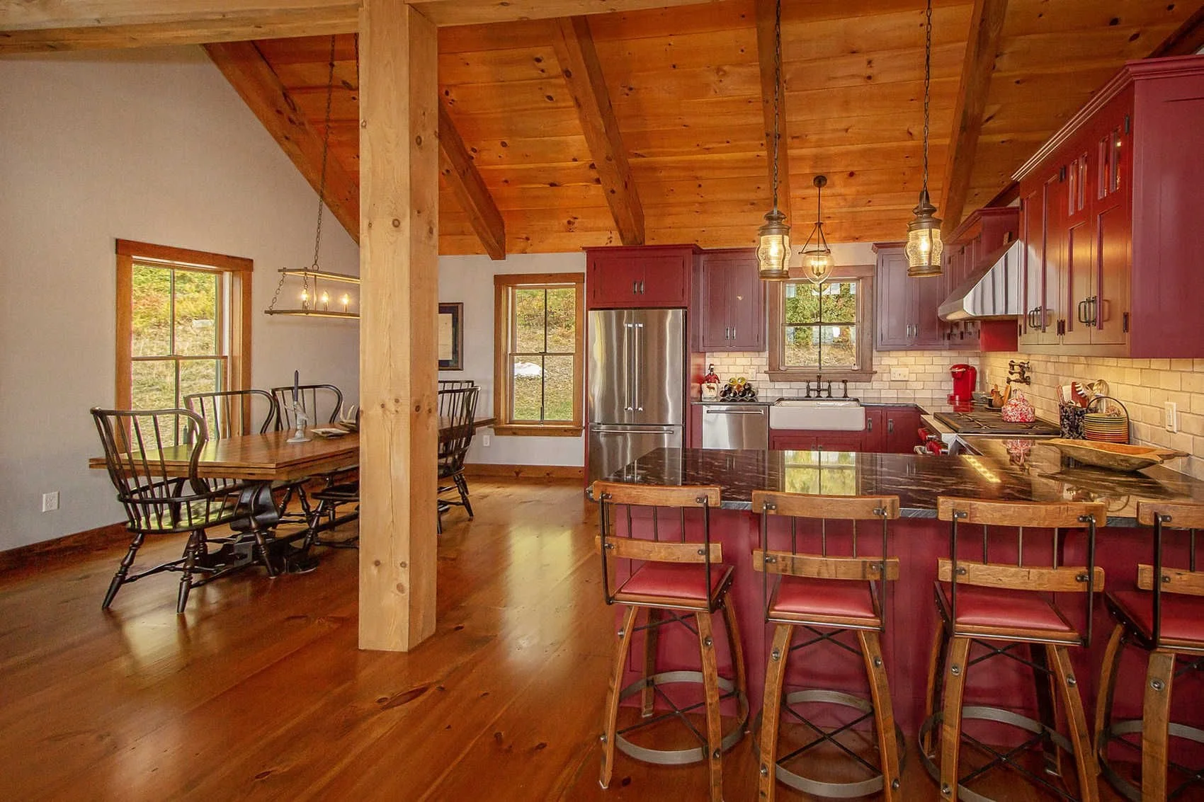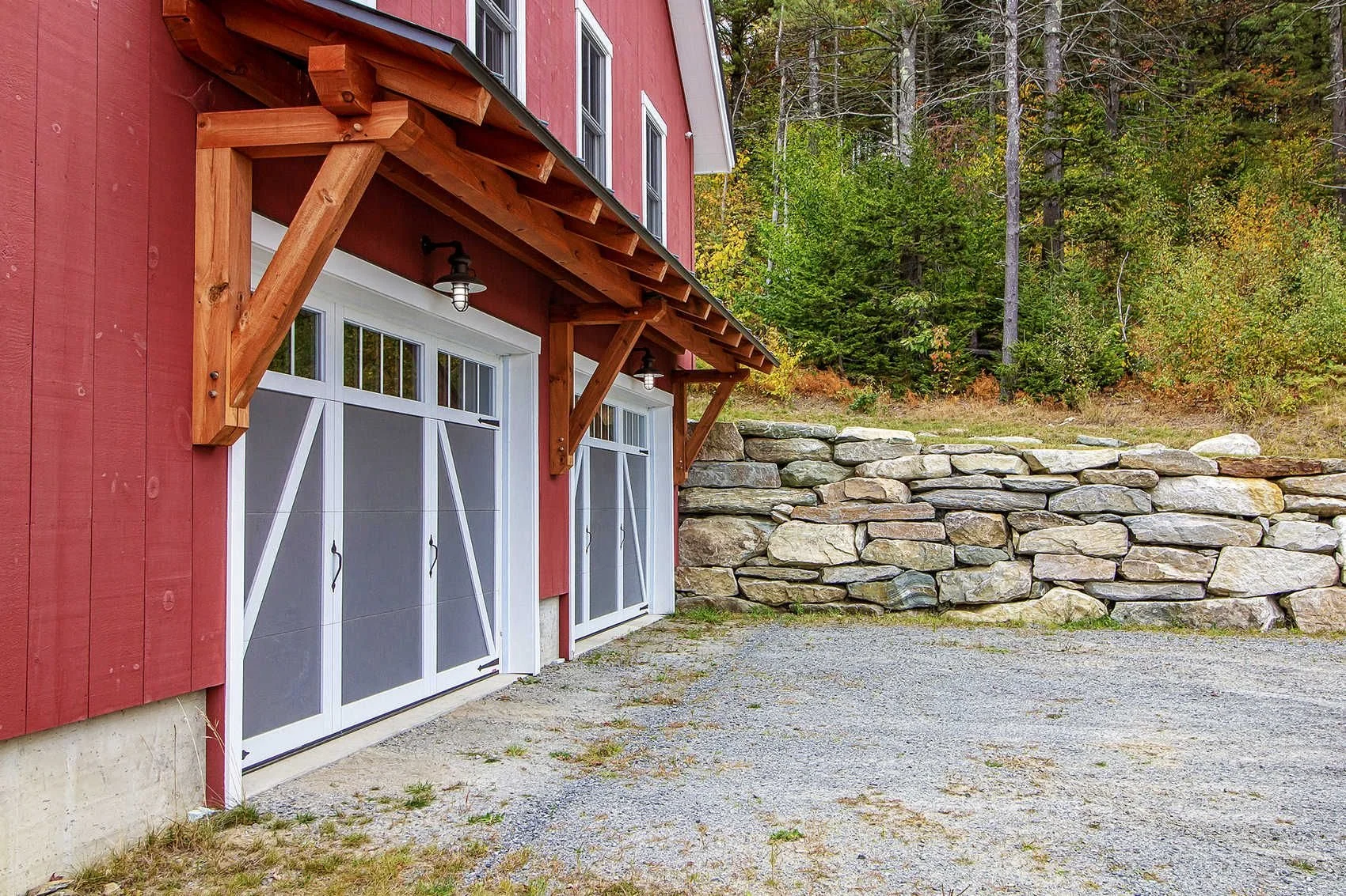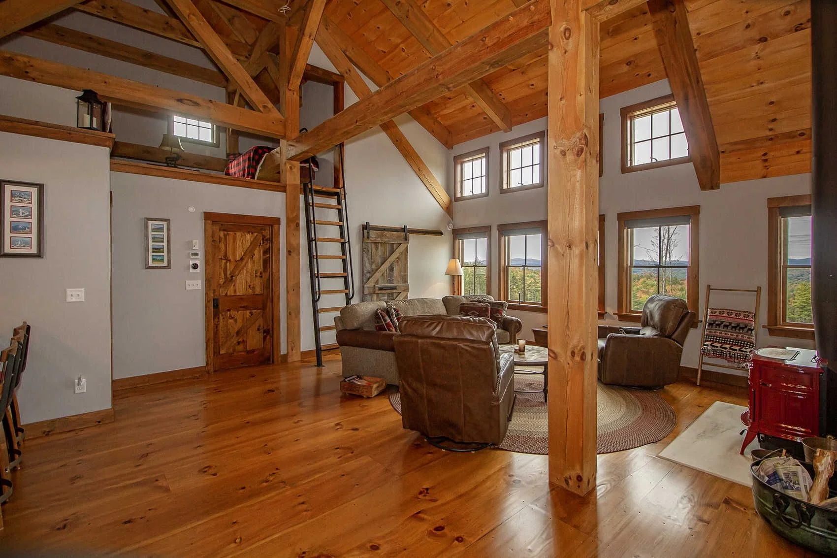 Barn House II is a timber frame barn-style house with a two-car garage on the main level and living space upstairs.