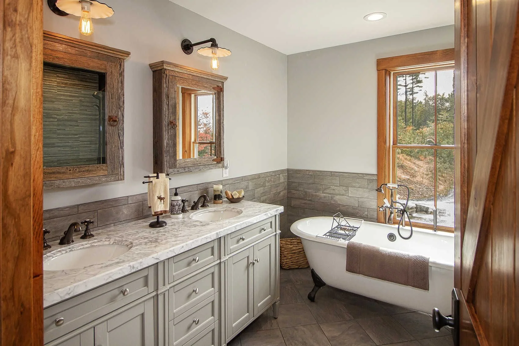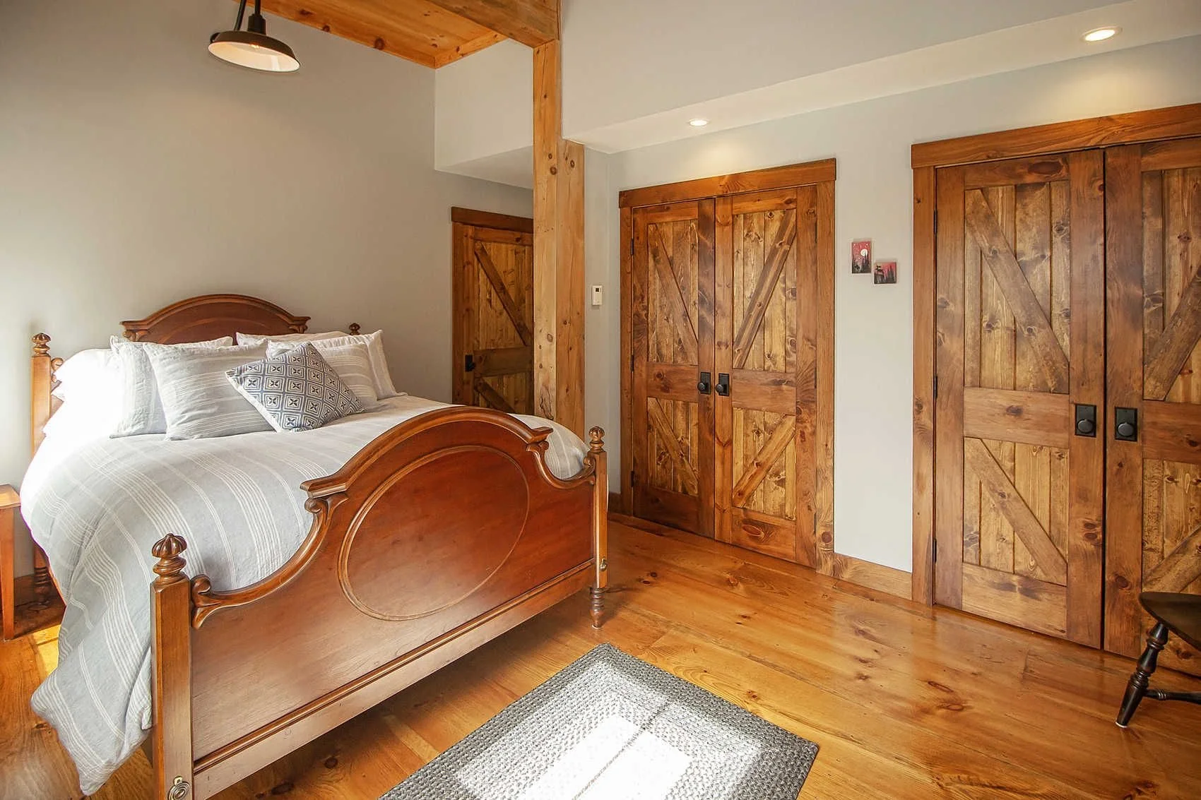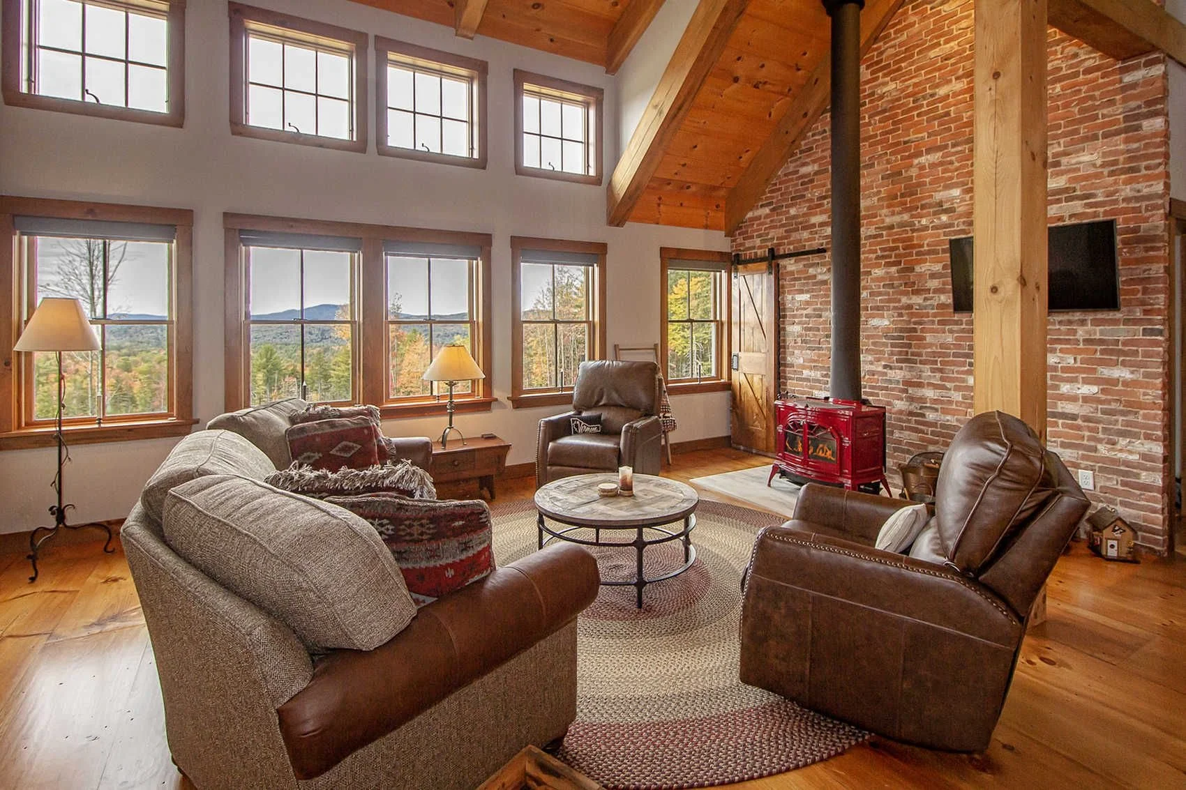 Barn House II is a timber frame barn-style house with a two-car garage on the main level and living space upstairs.