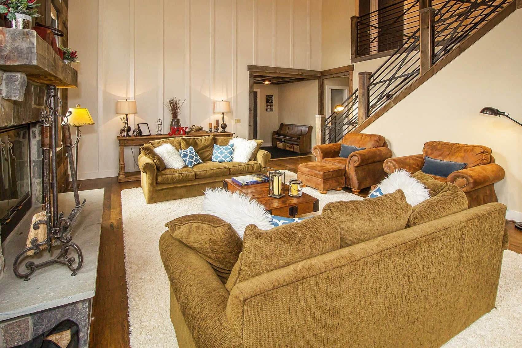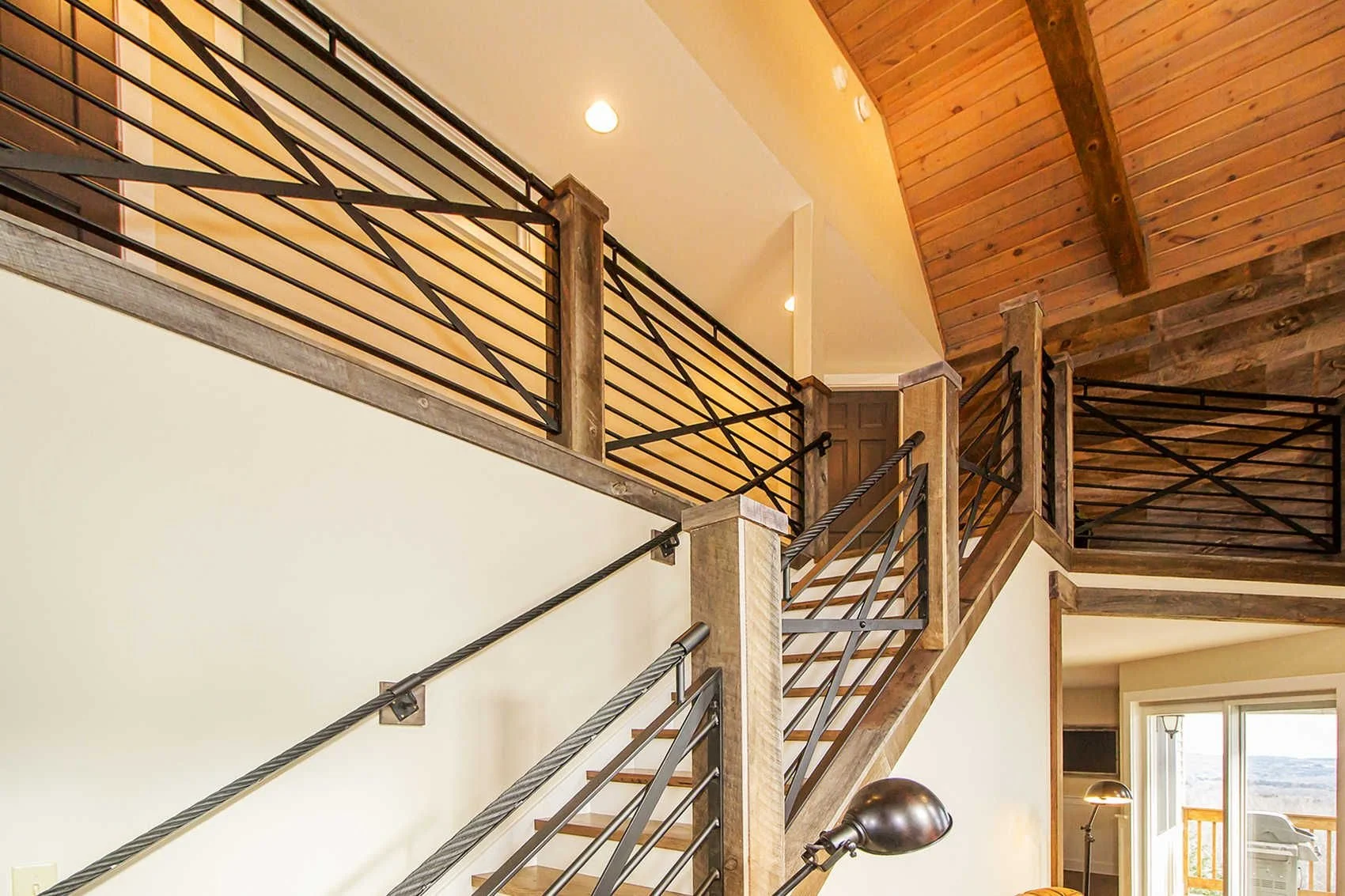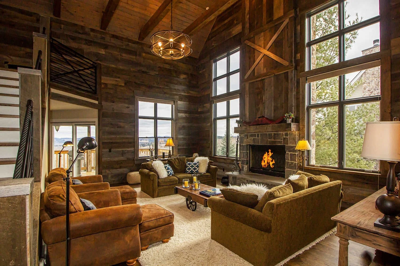 Reclaimed Great Room is a home renovation introducing wood walls, custom metal railings, and large board & batten wall details.