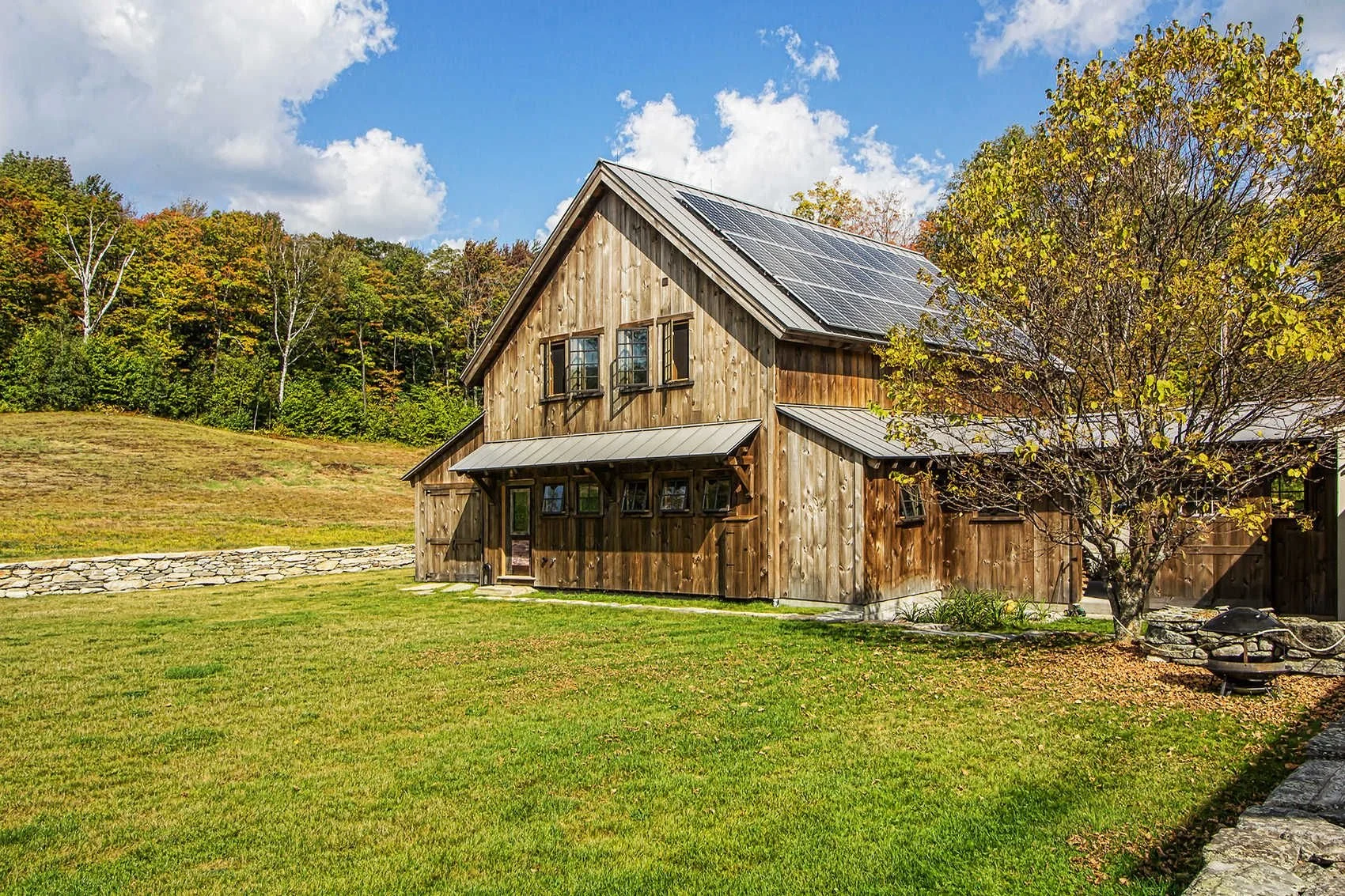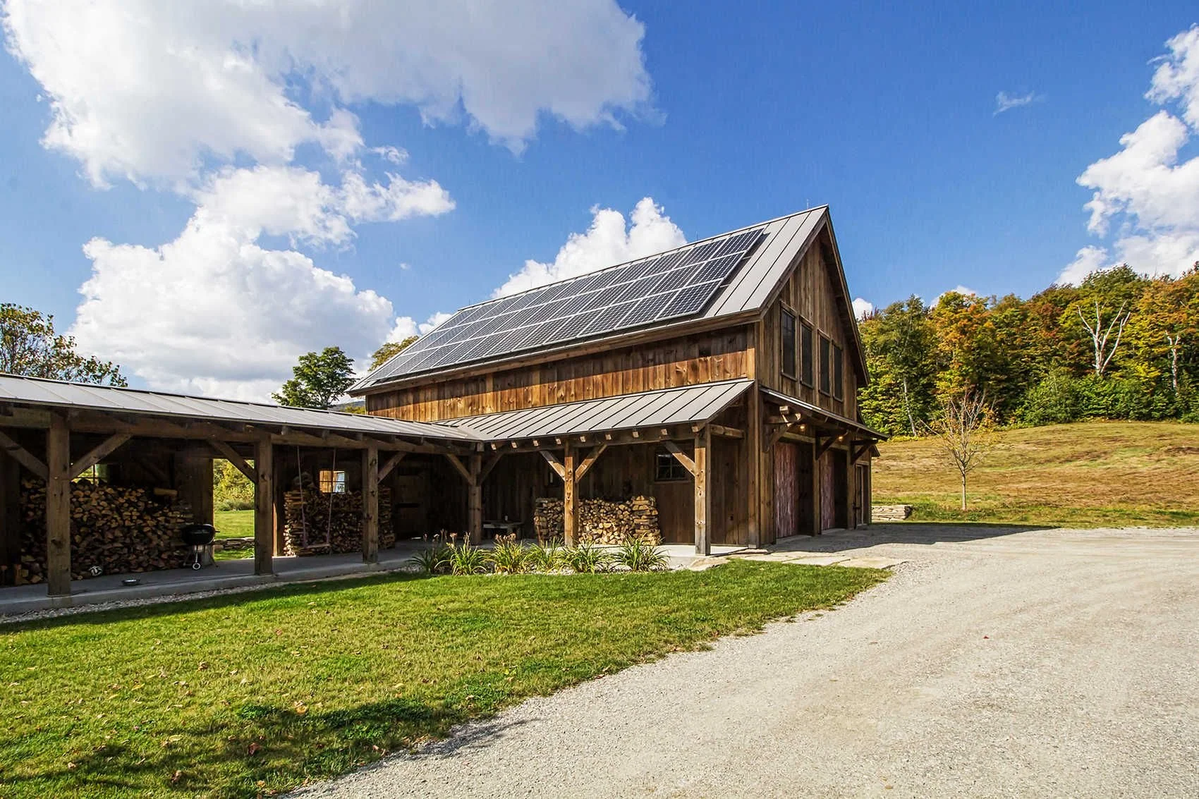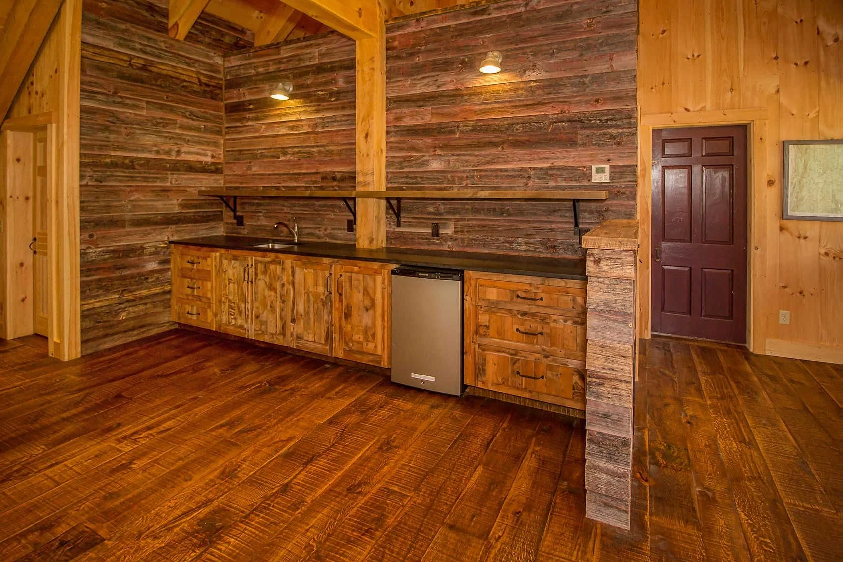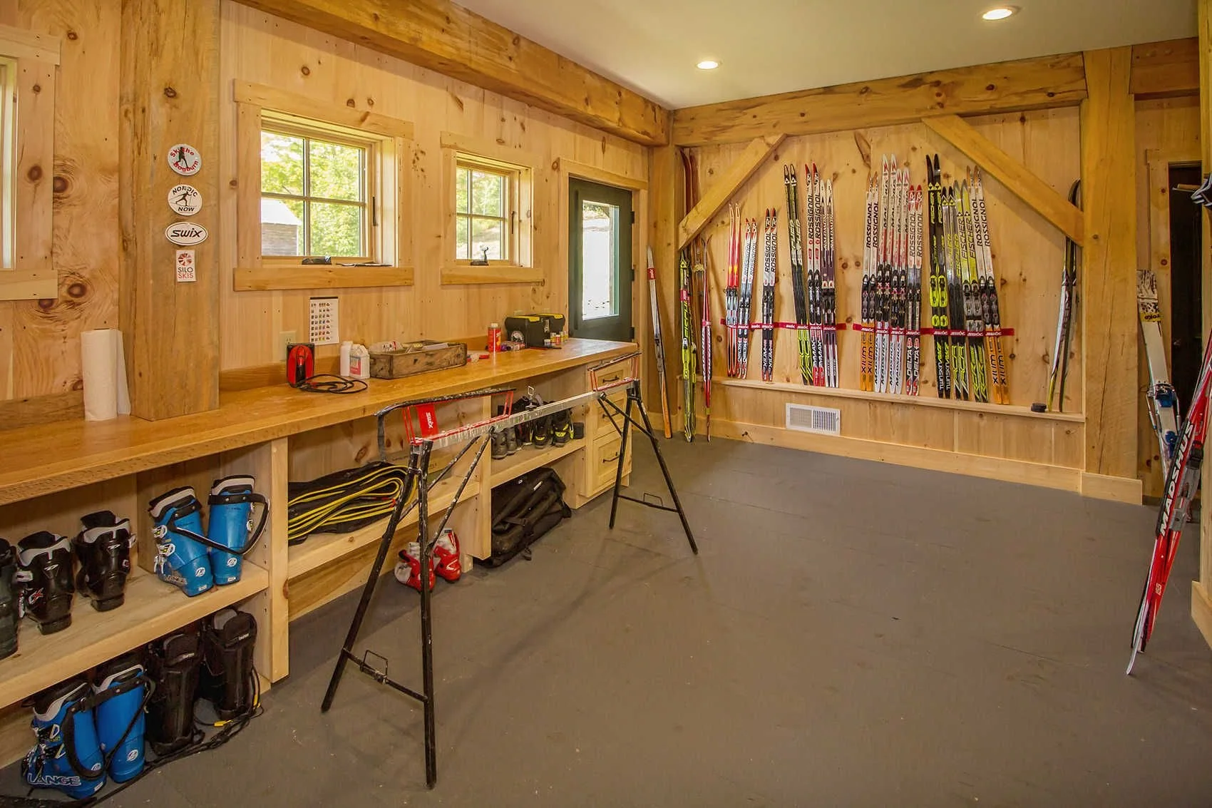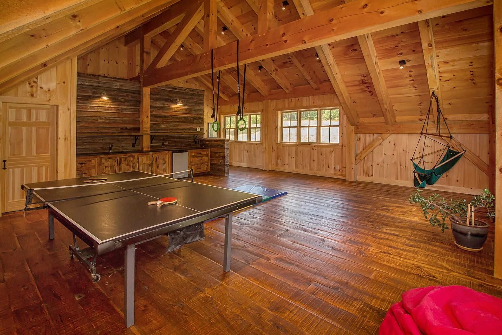 Ski Barn is a timber frame recreation barn with a two car garage & ski tuning room on the main level and a rec space & studio upstairs.